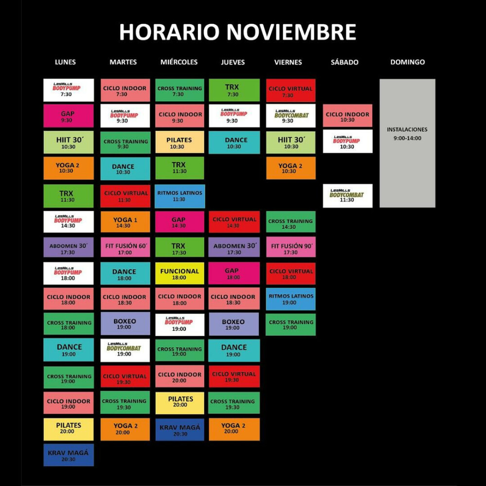 <b>Sala de musculación</b> <b>Lunes a Viernes:</b> 07:00 a 23:00 <b>Sábados:</b> 09:00 a 18:00 <b>Domingo y Festivos:</b> 09:00 a 14:00